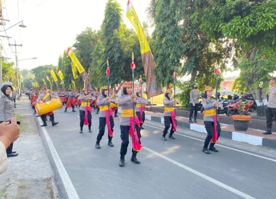 Mataram sergapye— Atraksi kesenian gendang belek binaan Polres Lombok Tengah tampil pada saat acara pelepasan Wisudawan Purna Bhakti bagi purnawirawan…
