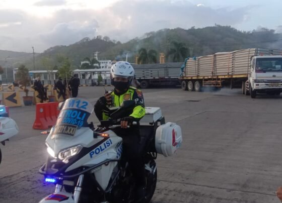Lobar sergapye–Kedatangan Logistik Grand Stand Kejuaraan World Superbike (WSBK) di Dermaga Gili Mas Lembar, Sabtu (16/10/2021). Mendapat pengawalan Polisi saat…
