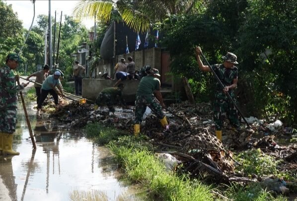 Personel Kodim 1606/Mataram Gotong Royong Bersihkan Saluran Air