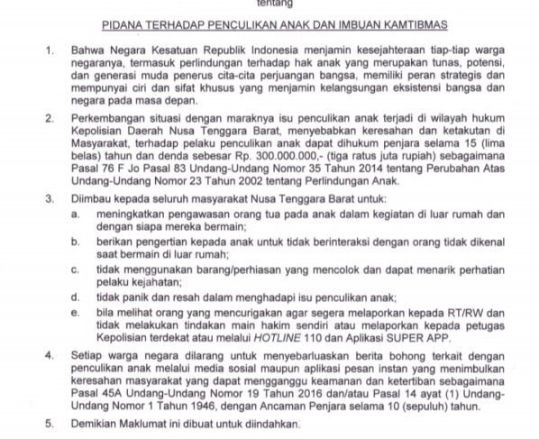 Isu Penculikan Anak Menghawatirkan, Kapolda NTB Keluarkan Maklumat
