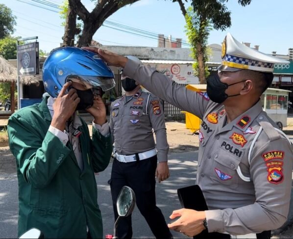 Kegiatan Simpatik, Lantas Polres Lombok Utara Bagi Helm dan Payung untuk Pengendara Motor