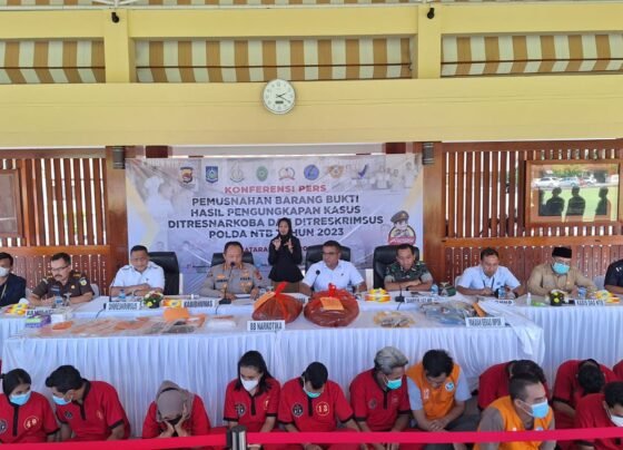 Mataram sergapye—-Polda NTB menggelar jumpa pers pemusnahan barang bukti narkotika, ganja dan pakaian impor. Ekas. Turut serta dihadirkan puluhan tersangka…